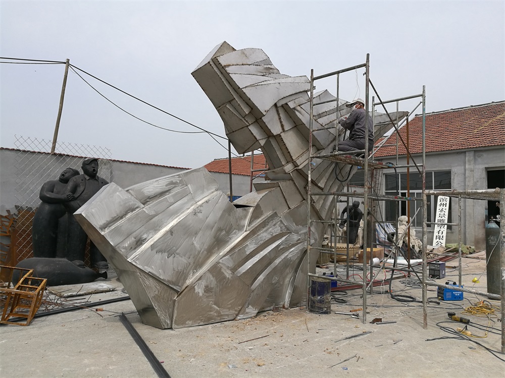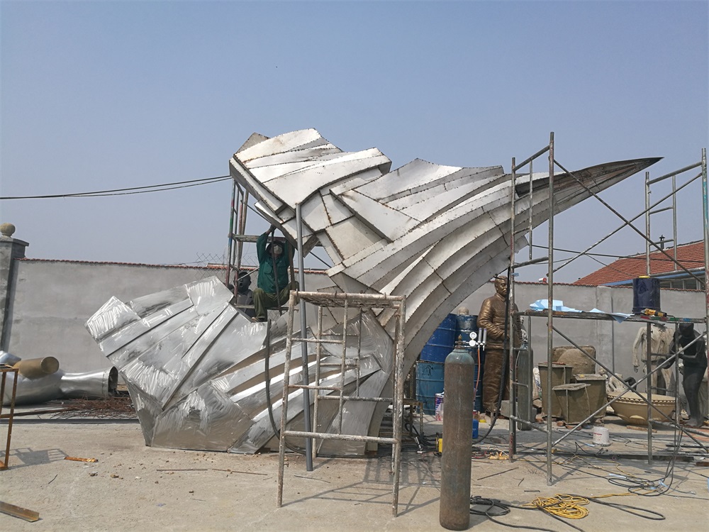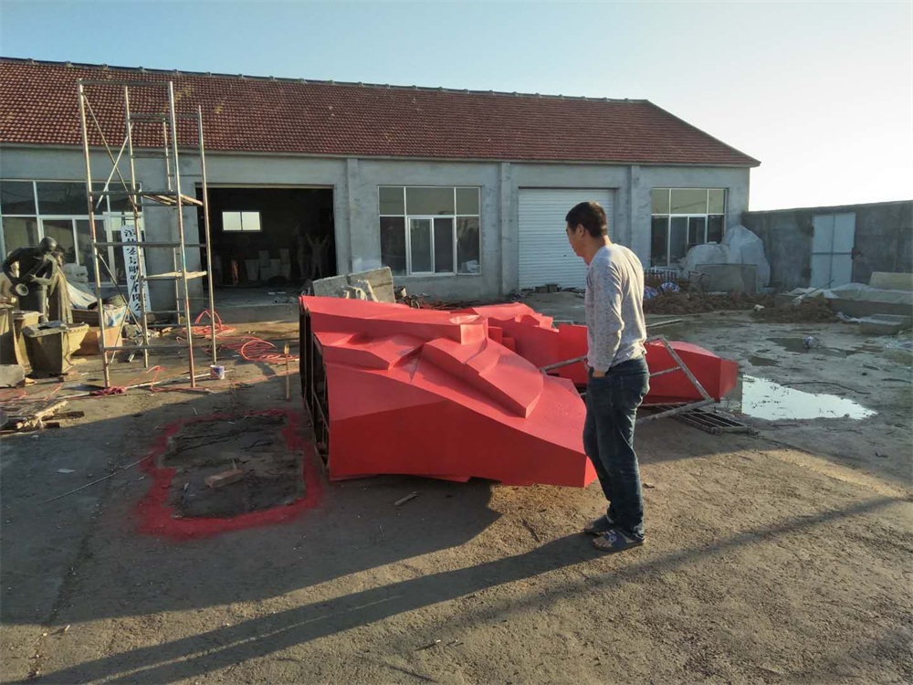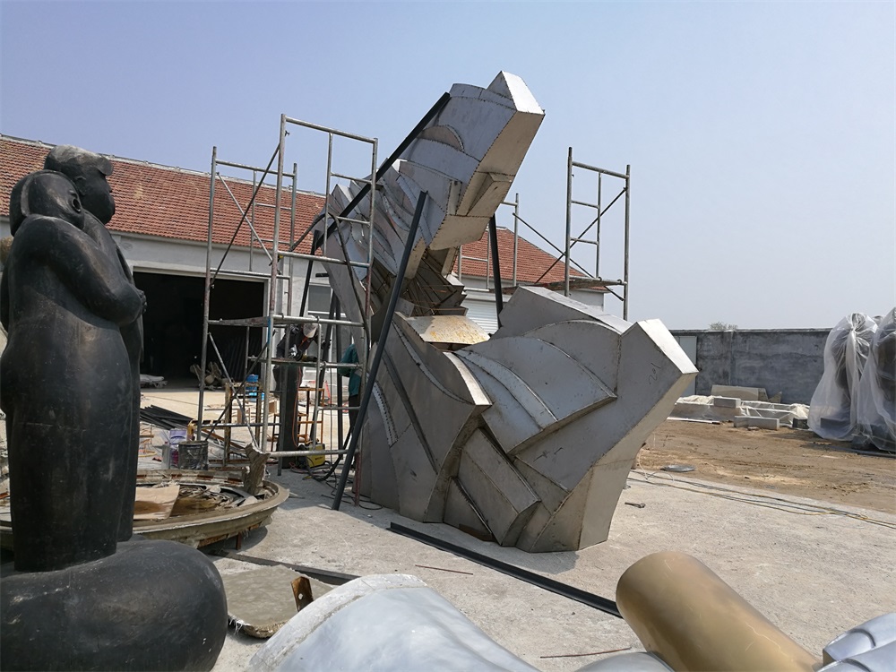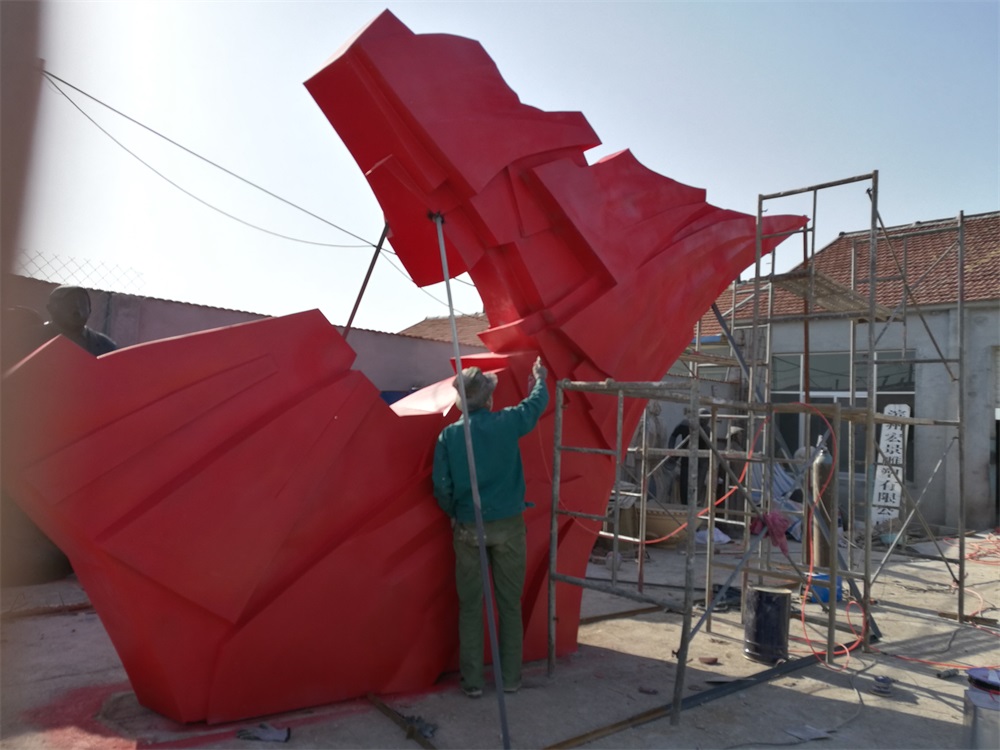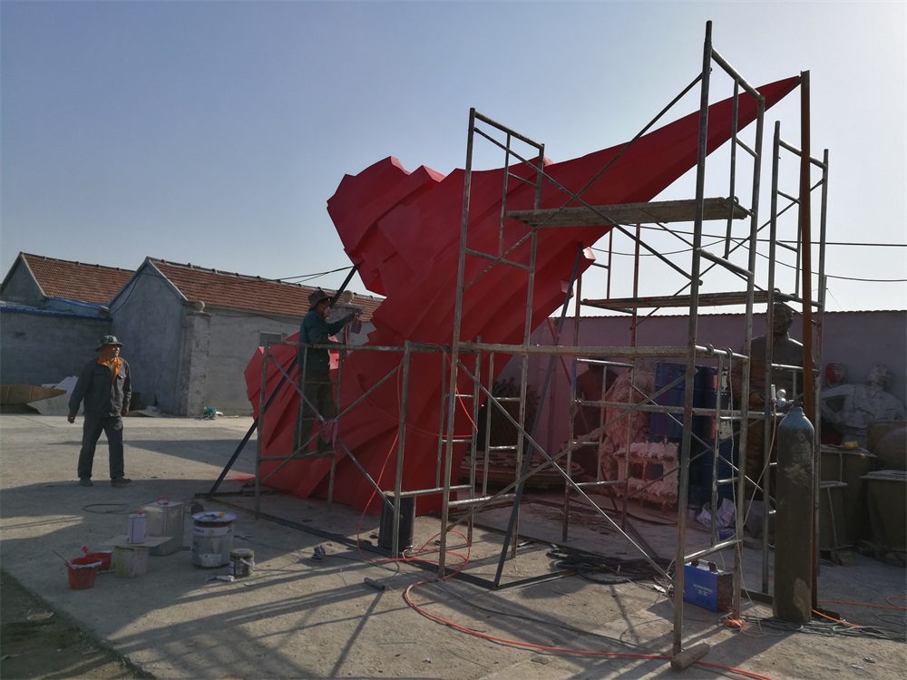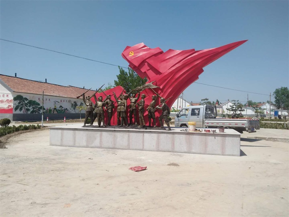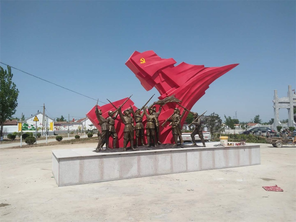雕塑說明:紅旗雕塑采用不銹鋼鍛造工藝做型,高4米,長(zhǎng)8米。人物群雕共10個(gè)人物,采用玻璃鋼工藝制作。