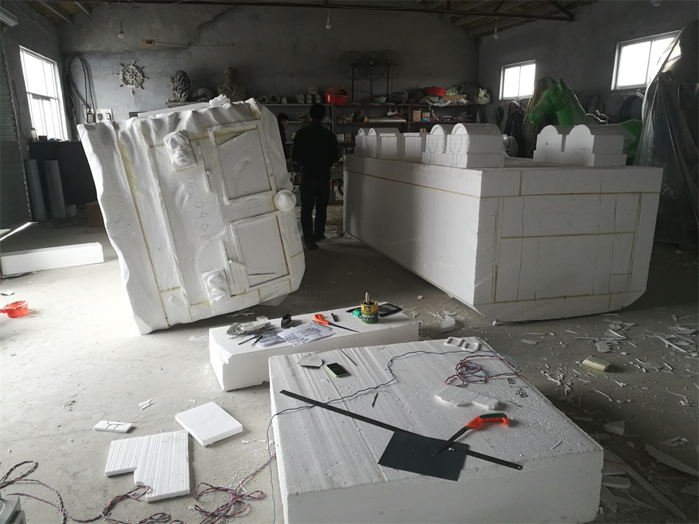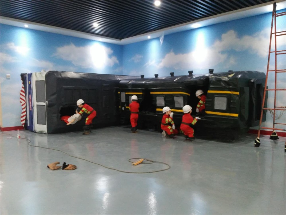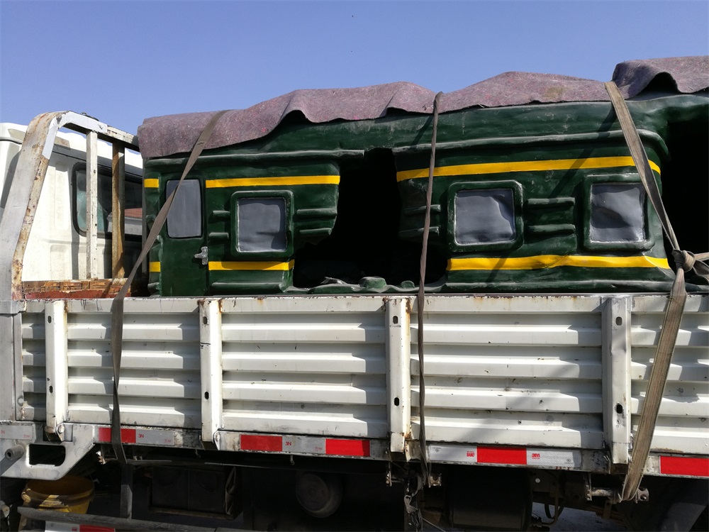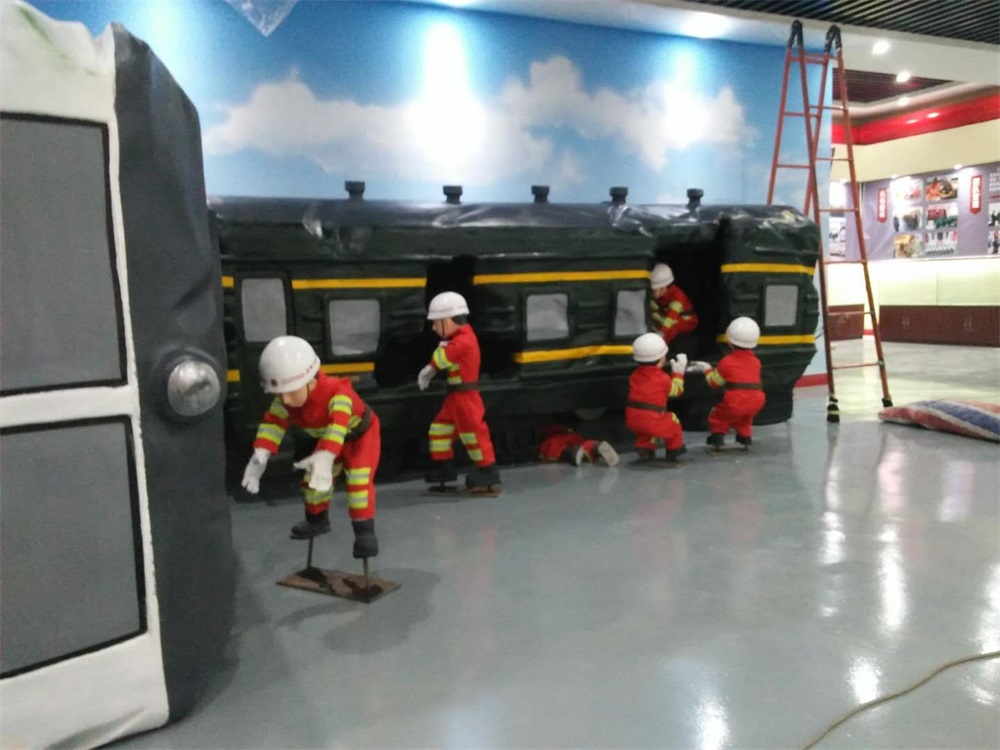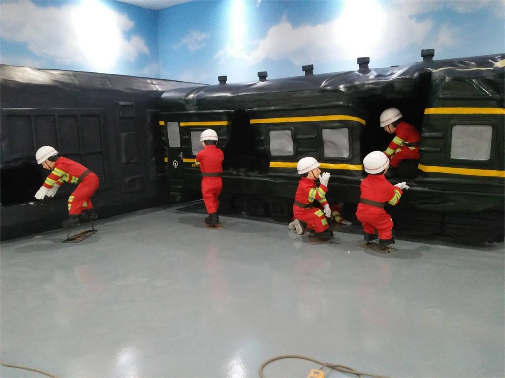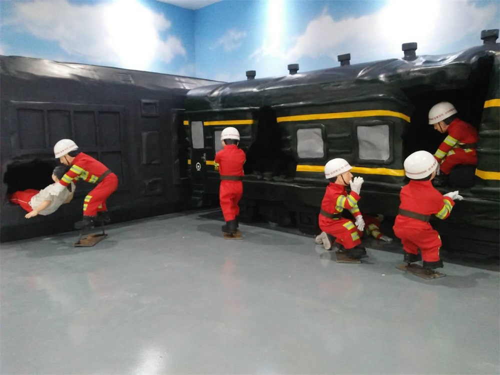 雕塑說明:雕塑整體場景以發(fā)生在淄博市境內(nèi)的一場火車碰撞事故救援現(xiàn)場為題材。火車模型采用泡沫雕塑工藝制作,表面彩繪。消防人物雕塑采用玻璃鋼雕塑工藝制作。