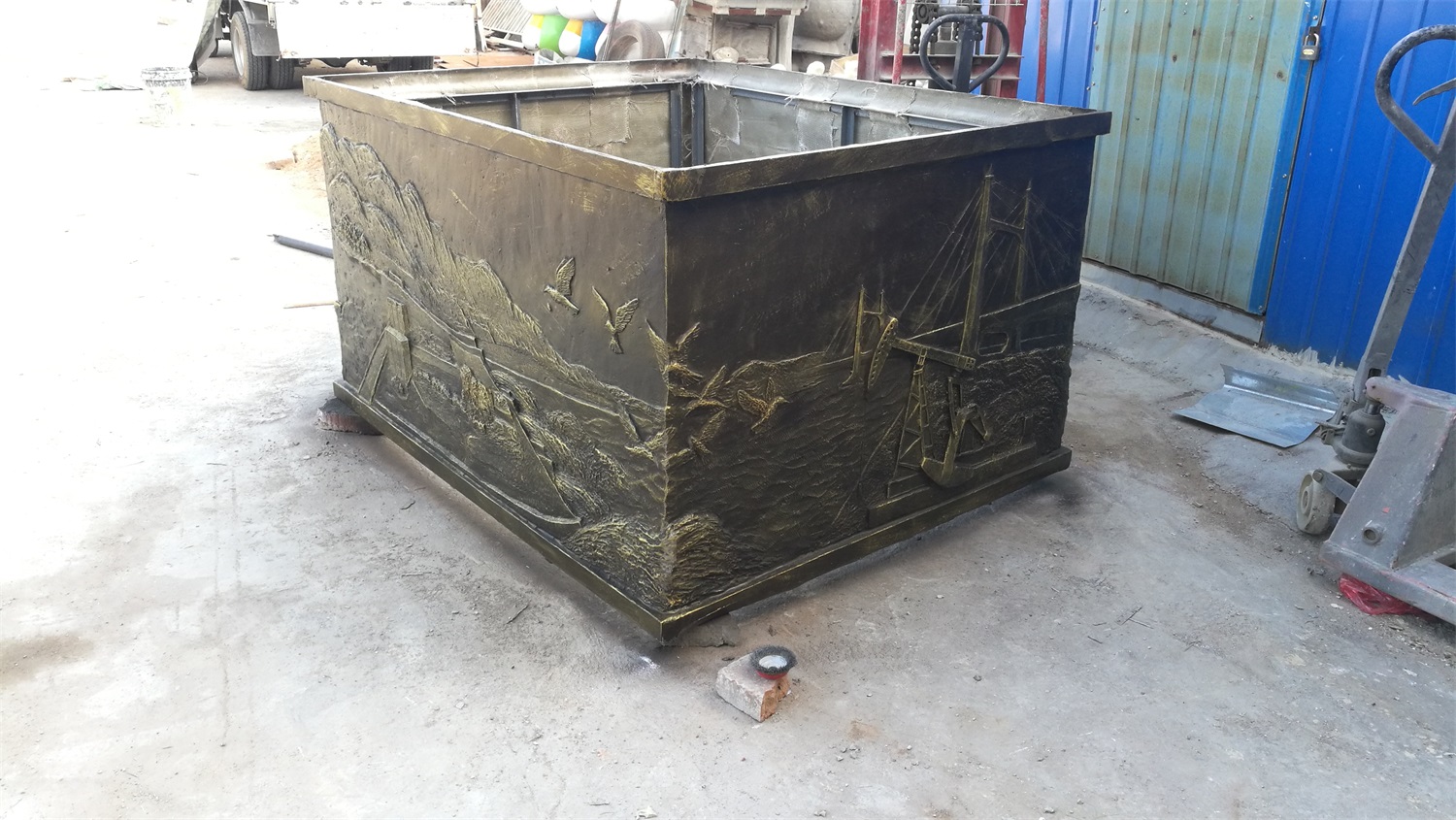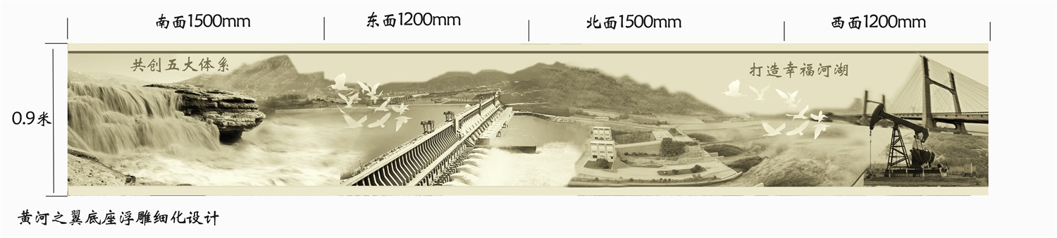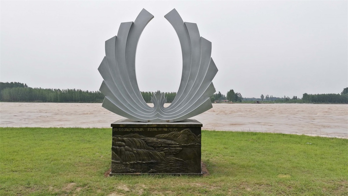 “黃河之翼”雕塑取形抽象翅膀、也像海浪,寓意黃河實(shí)業(yè)的騰飛和理想;像花朵,寓意著美好幸福;中心的花心,寓意著黃河不變的初心。底座浮雕體現(xiàn):共創(chuàng)五大體系,打造幸福河湖、堅(jiān)實(shí)的堤防、生態(tài)補(bǔ)水(水閘引水)、人水和諧(濕地飛鳥(niǎo))、勝利油田、滄海桑田(肥沃農(nóng)田)等。